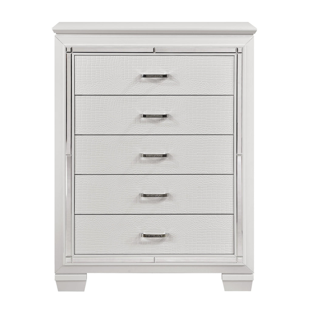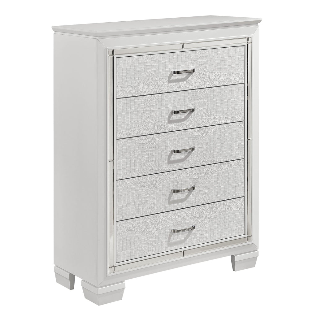 • Faux alligator embossed, textural drawer fronts with beveled mirror trim