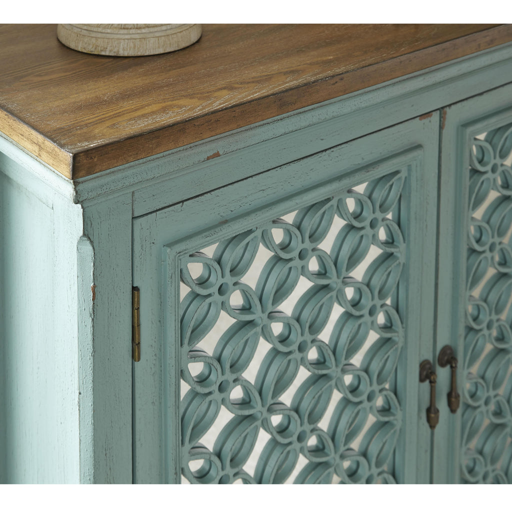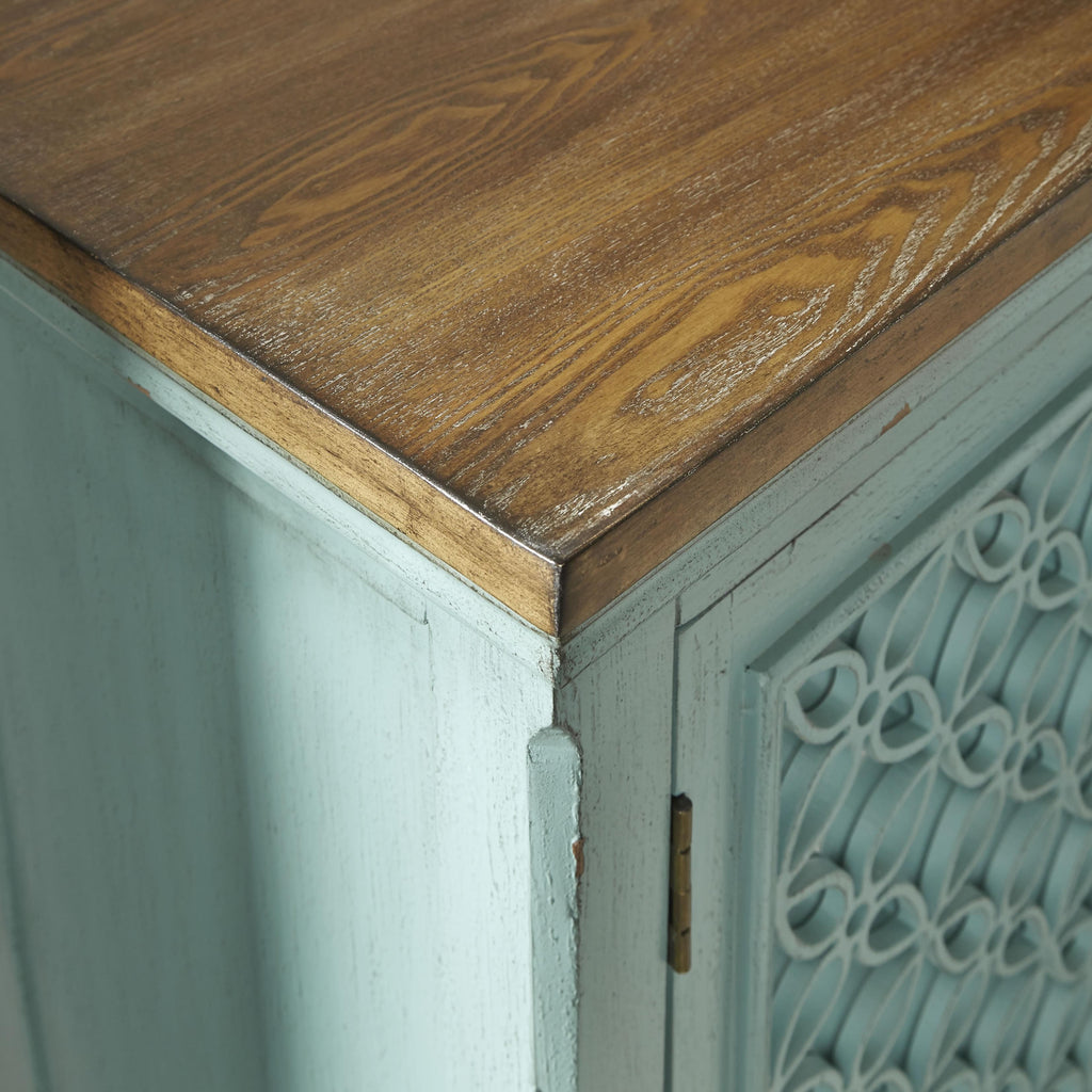 • Turquoise finish with worn wood tone top