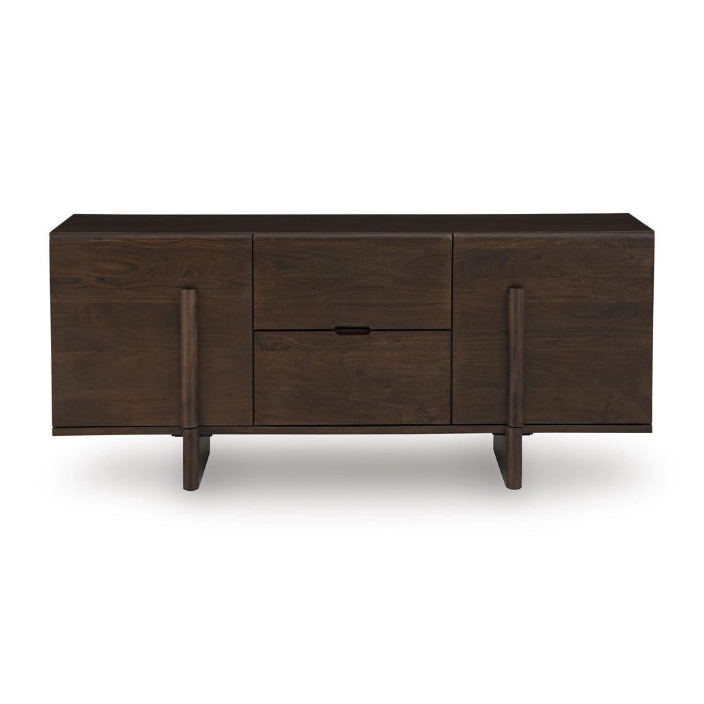 This accent cabinet expertly blends function with stunning contemporary form. Its clean, linear design is draped with an inviting medium... This accent cabinet expertly blends function with stunning contemporary form. Its clean, linear design is draped with an inviting medium brown finish. An angular base further emboldens the look with forward-thinking style. Storage has never been so striking. View more