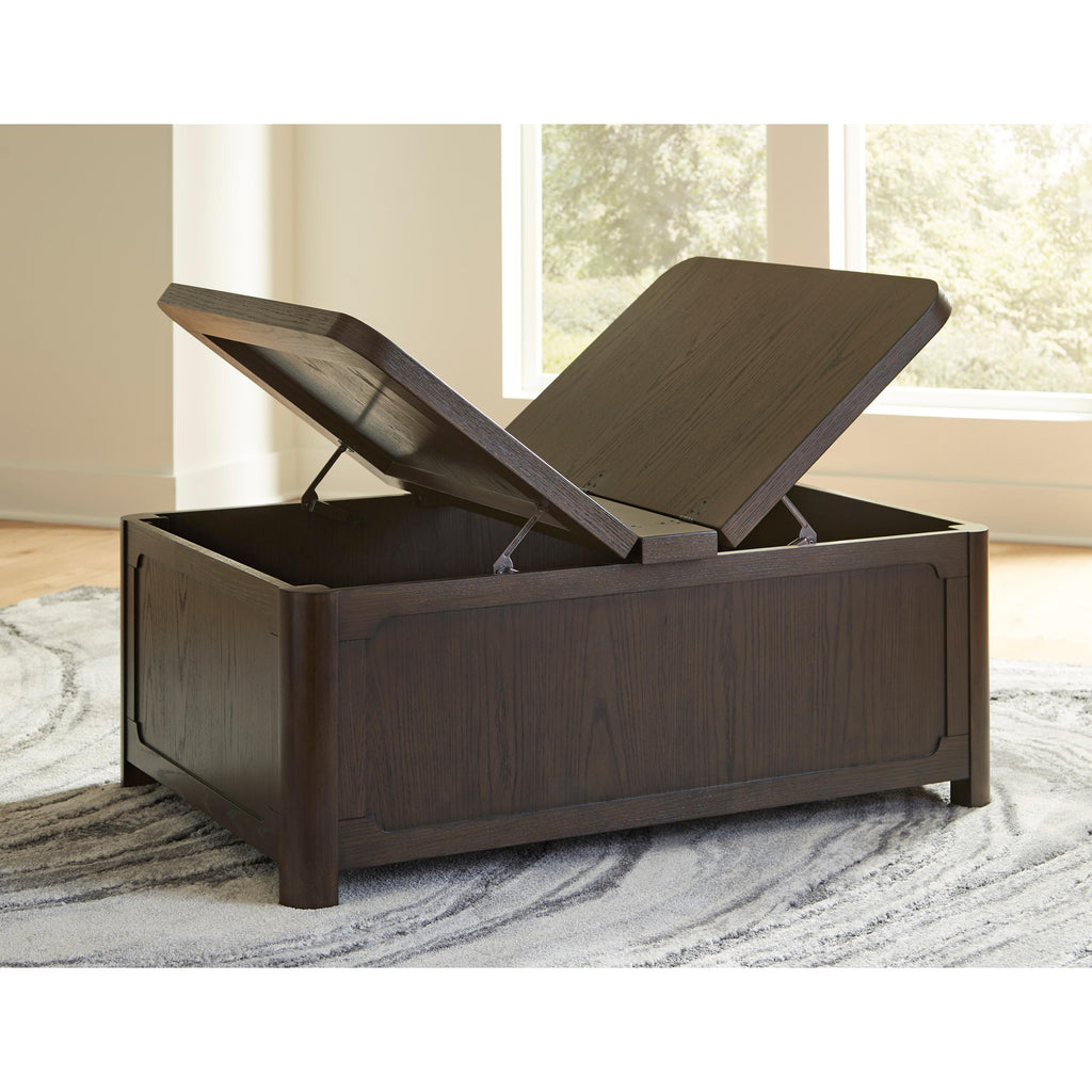 • 2-sided hinged top opens to reveal storage