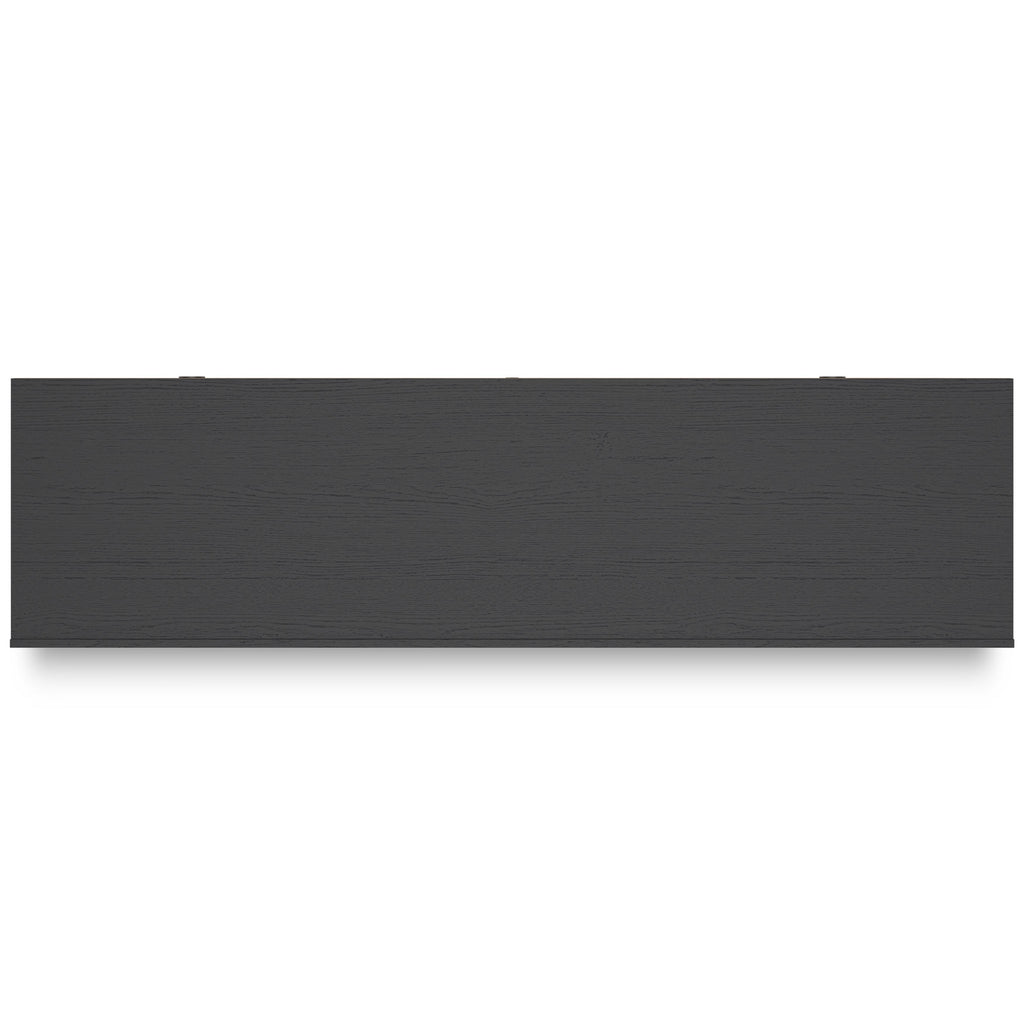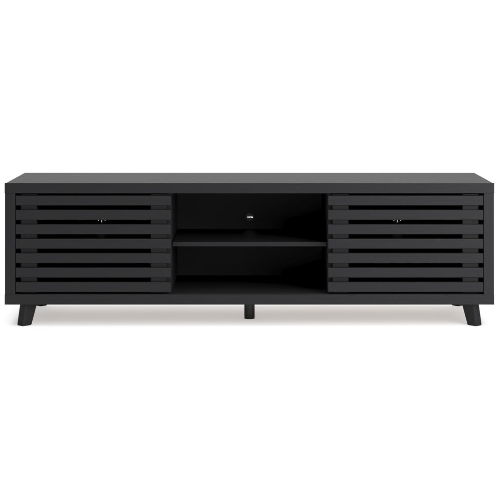 Entertain the art of modern living with this TV stand. Pairing a subtle wood grain look with a trend-right matte... Entertain the art of modern living with this TV stand. Pairing a subtle wood grain look with a trend-right matte black finish, it’s beautifully in tune with your clean-lined design sensibility. Packed with potential, two sliding doors reveal even more adjustable shelving, just the ticket for storing your tech consoles, DVDs and games. View more