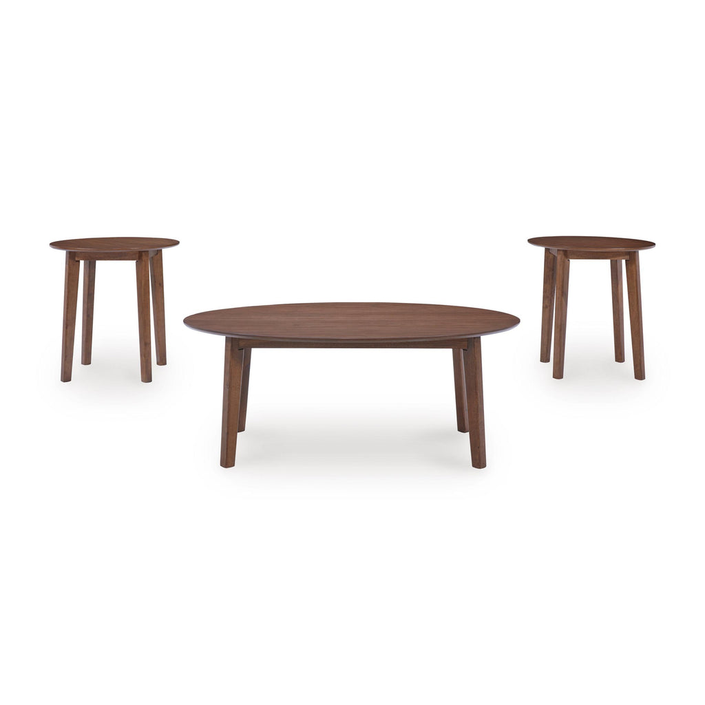 Stylish simplicity teams up with mod flair to define this table set. A versatile and inviting brown wood-tone finish on... Stylish simplicity teams up with mod flair to define this table set. A versatile and inviting brown wood-tone finish on the coffee table and end tables enhances the stunning wood grain character. Rounded tops polish off the design with a dash of mid-century appeal. View more